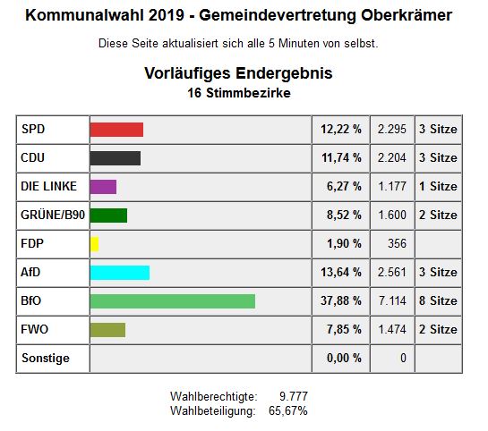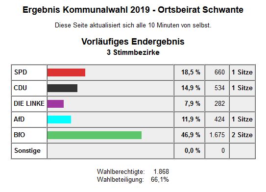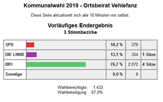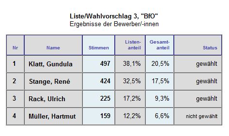 Wir als BfO bedanken uns bei den Wählern für das entgegengebrachte Vertrauen und wir werden gemeinsam mit den anderen gewählten Parteien und Gruppierungen konstruktiv und sachbezogen in den einzelnen neu formierten Ortsbeiräten und in der neuen Gemeindevertretung zusammenarbeiten. Gleichzeitig möchten wir uns für den fairen Wahlkampf und für die großartige Unterstützung zahlreicher Bürgerinnen und Bürger aus unserer Gemeinde bedanken.