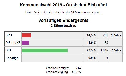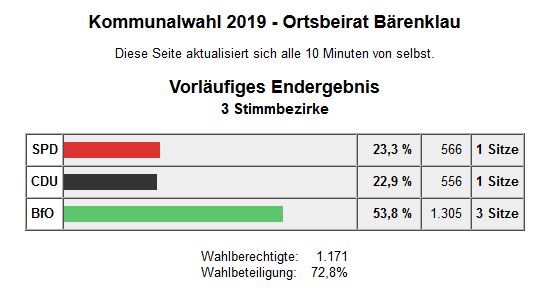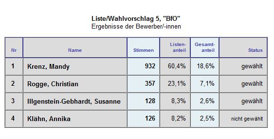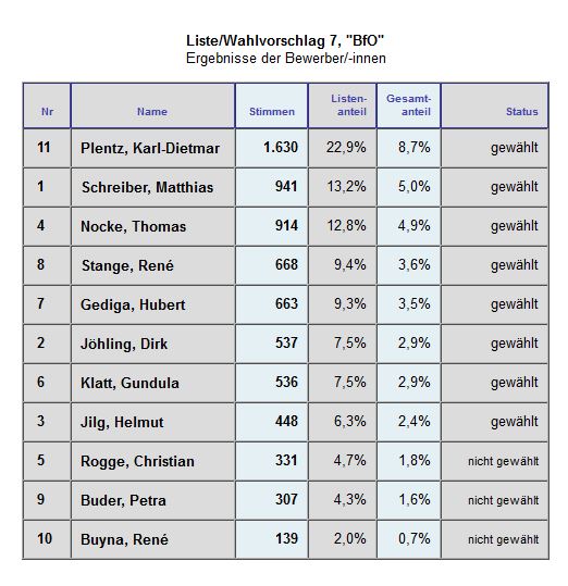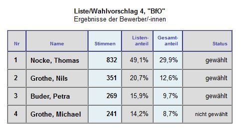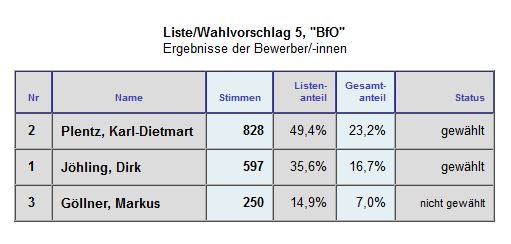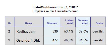 Gerade über dieses Wahlergebnis zeigte man sich seitens der BfO sehr zufrieden, da es der Wählervereinigung immer wichtig ist, stark in den einzelnen Ortsbeiräten vertreten zu sein. Auch bei der Wahl im Kreis wird man mit Karl-Dietmar Plentz einen Kandidaten in den neuen Kreistag entsenden.