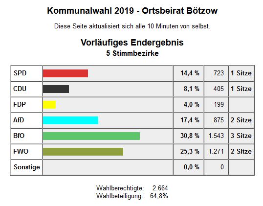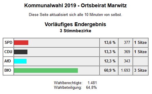Auch in den einzelnen Ortsbeiräten legte man nochmal kräftig zu. So holte die BfO zum Beispiel in Vehlefanz 76,6 Prozent und damit 4 von 5 Sitzen im Ortsbeirat, in Eichstädt 73,5 Prozent (2 von 3), Bärenklau 53,8 (3 von 5) und Marwitz 60,9 und damit 3 von 5 Sitze. In allen angetretenen Ortsteilen war die BfO die stärkste Kraft. In Bötzow holte die Wählervereinigung 30,8 Prozent und 3 von 9 Sitzen und in Schwante erreichte man 46,9 Prozent und 2 von 5 Sitze.